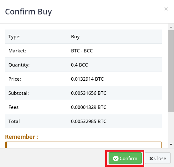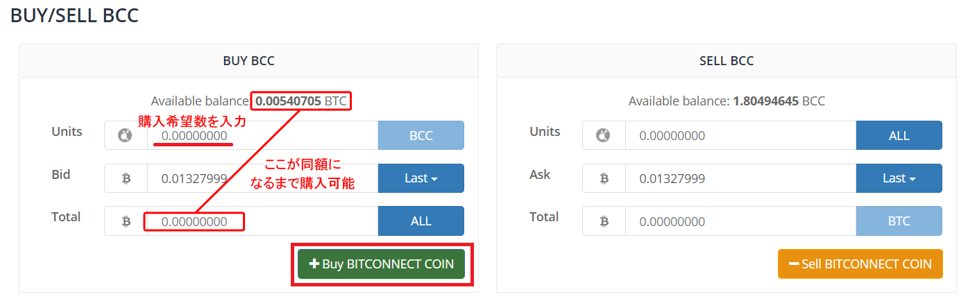 入金したBTCでBCCを購入します。下記の通りTotal分のBCCを記入して「+Buy BITCONNECT COIN」をクリックします。