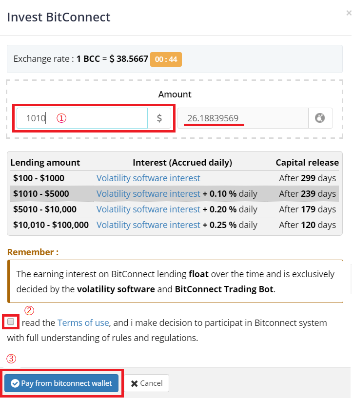 ②「私は利用規約を読んでおり、ルールと規制を完全に理解してBitconnectシステムに参加することを決めました」にチェックをします。