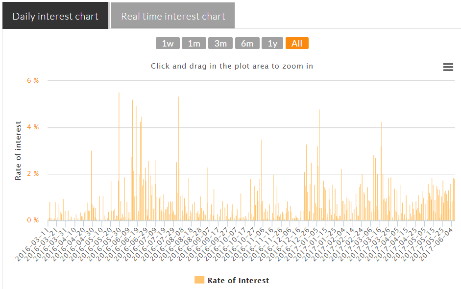 低いところだと無配当も存在し(ほぼ)無配当が約2割存在、それを除けば1.0%前後/日を推移して配当が発生しております。