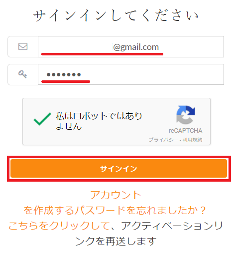 登録したアドレス、パスワードを入力の後人間認証にチェック