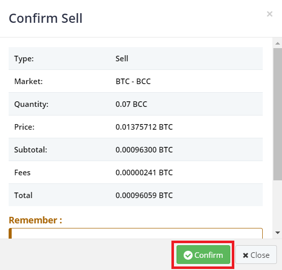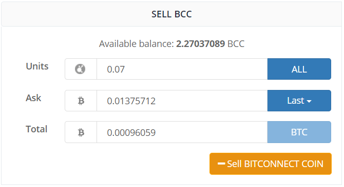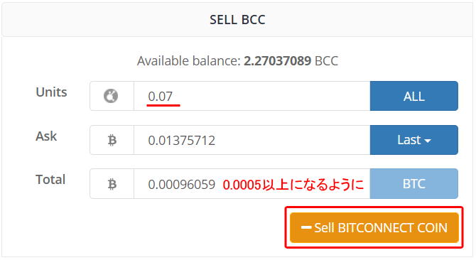 下記の通りTotal分のBTC(0.0005以上)を記入して「- Sell BITCONNECT COIN」をクリックします。