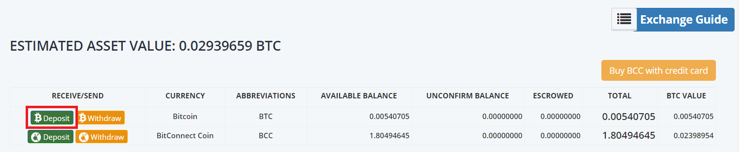 Bitcoinの列の「Deposit」をクリックしてください。