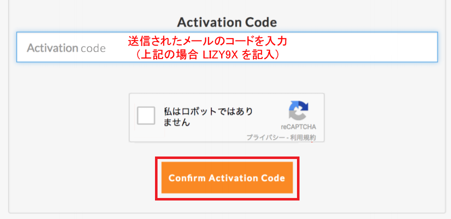 入力後人間認証にチェックを入れ「Confirm Activation Code」をクリックします。