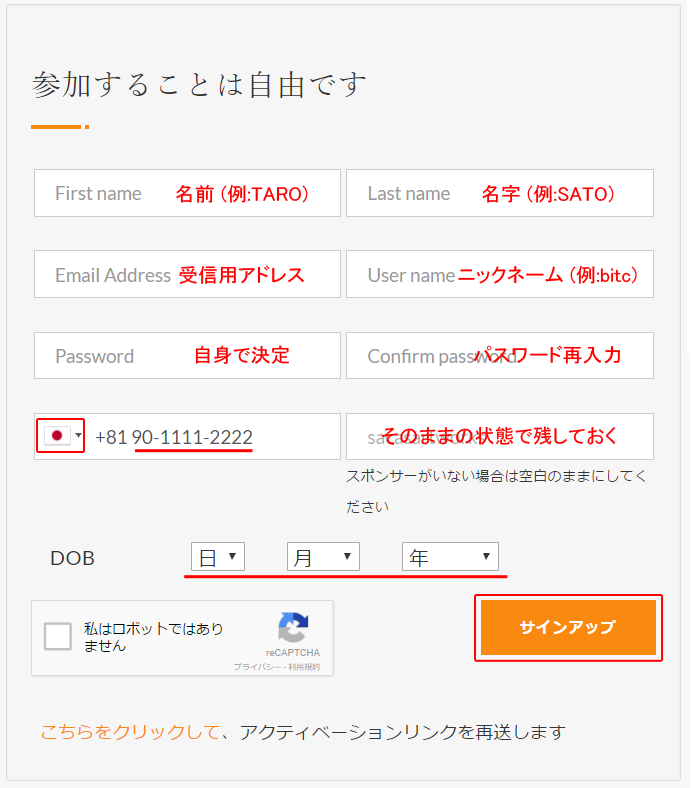 個人情報の記入をした後、人間認識にチェックを入れて「サインアップ」を選択します。