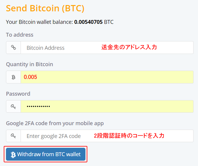 送金先のアドレスを入力し、引き出すBTCの各を入力(0.005以上)、パスワードが間違っていないかを確認の後「Withdraw from Bitcoin wallet」をクリックします。