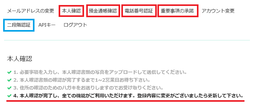 本人確認の欄を選択すると画面に現在のステータスが表示されます。