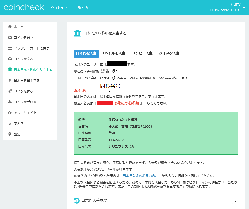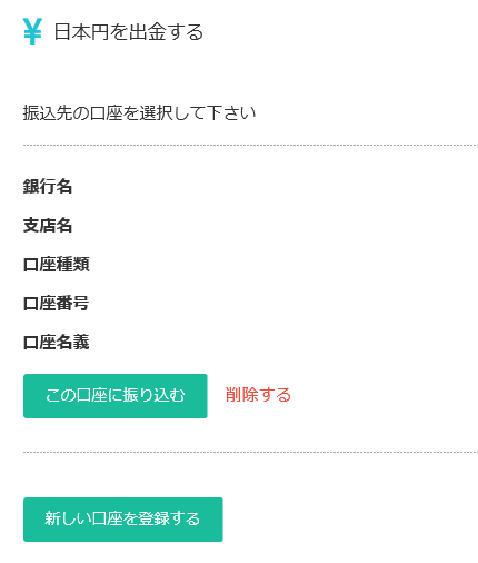 取引所に表示された日本円を銀行振込する画面です。通常1~2日で口座に反映されます。