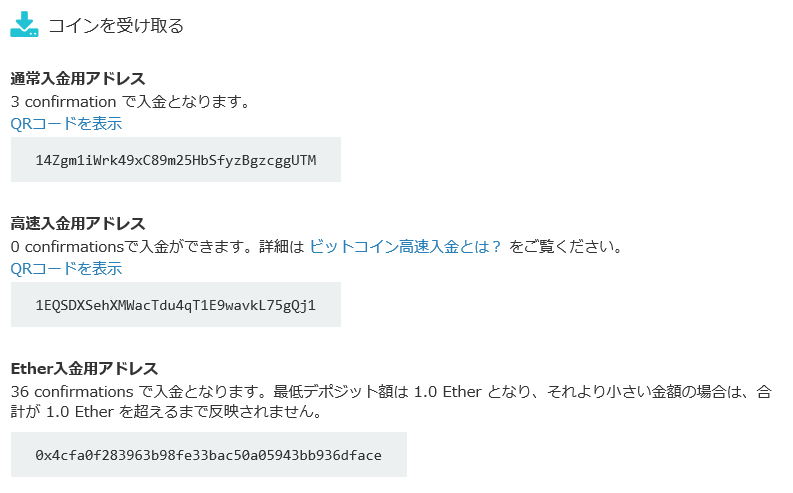 他取引所、ウォレットから仮想通貨を受け取る場合に使用します。