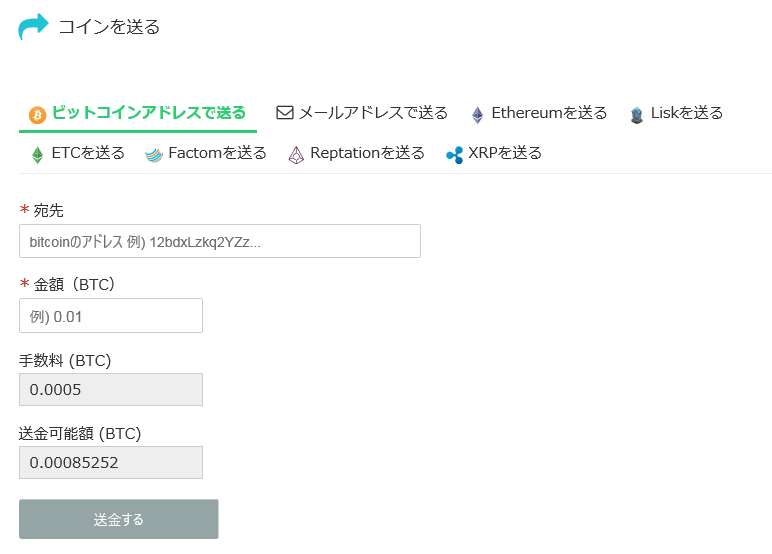 他取引所、ウォレットへ仮想通貨を送金する場合に使用します。