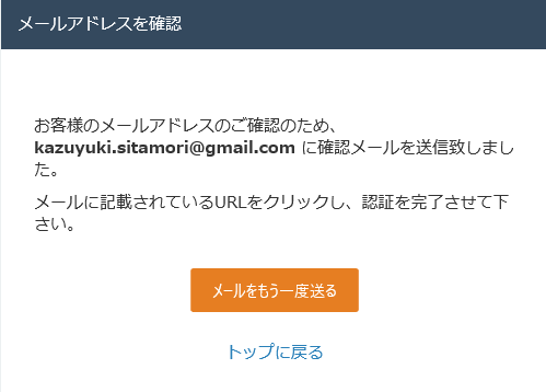 こちらの画面に切り替わりメールアドレスに案内が届きます。