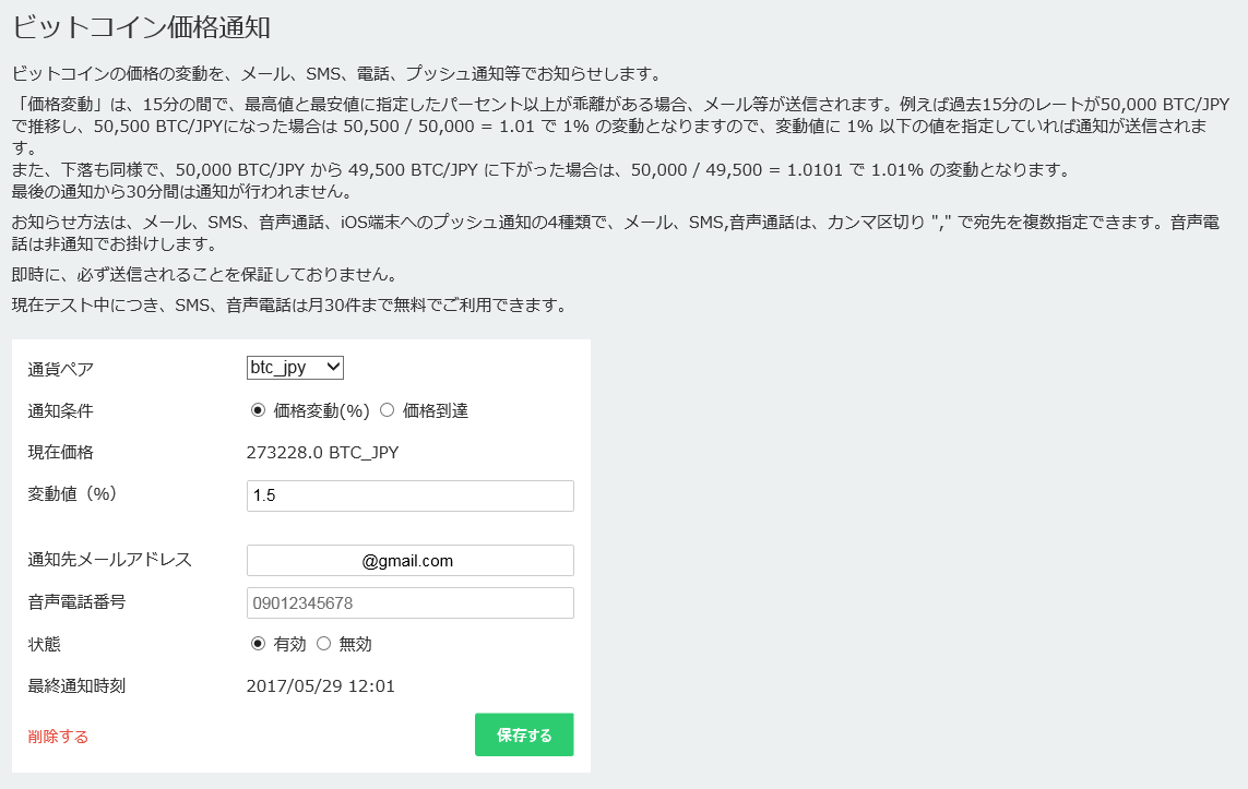 一定の価格になった場合メール、電話で通知を行ってくれる機能です。