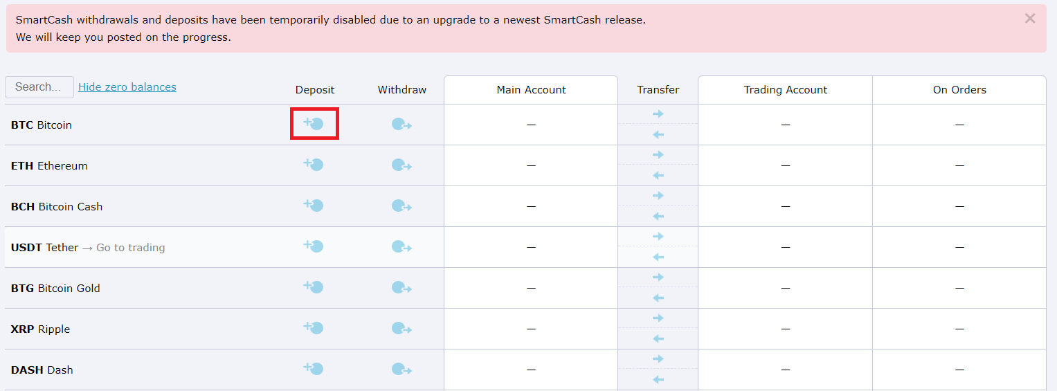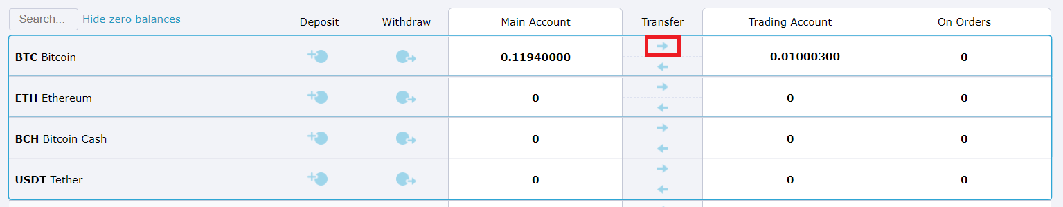 実際のトレードの前にHitBTCでは送金した通貨をTrading Accountに移し替える必要があります。