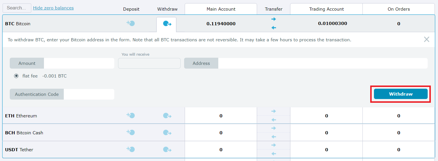 HitBTCで取り扱いのある各通貨を直接送金可能です。
