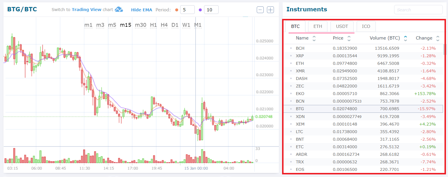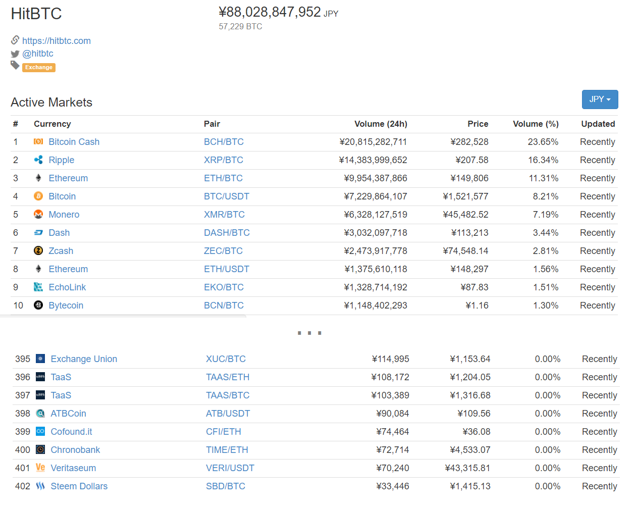 通貨ペアはBTC/ETH/USDTの3種で約400もの通貨ペアをもちます。