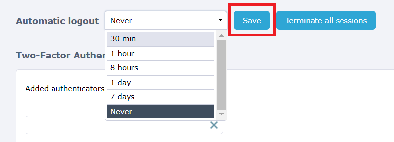 同じページにあるAutomatic logoutで時間(特に長期でトレードしない場合は1時間内を推奨)を設定し「Save」をクリックします。
