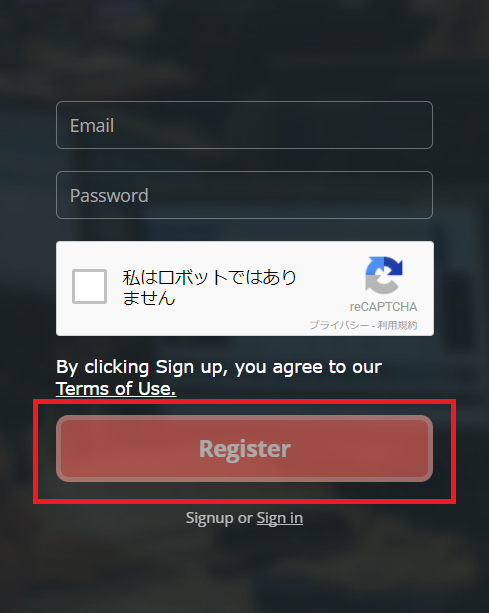 受け取り用メールアドレスとパスワードを入力の後人間認証を行い「Register」をクリックします。