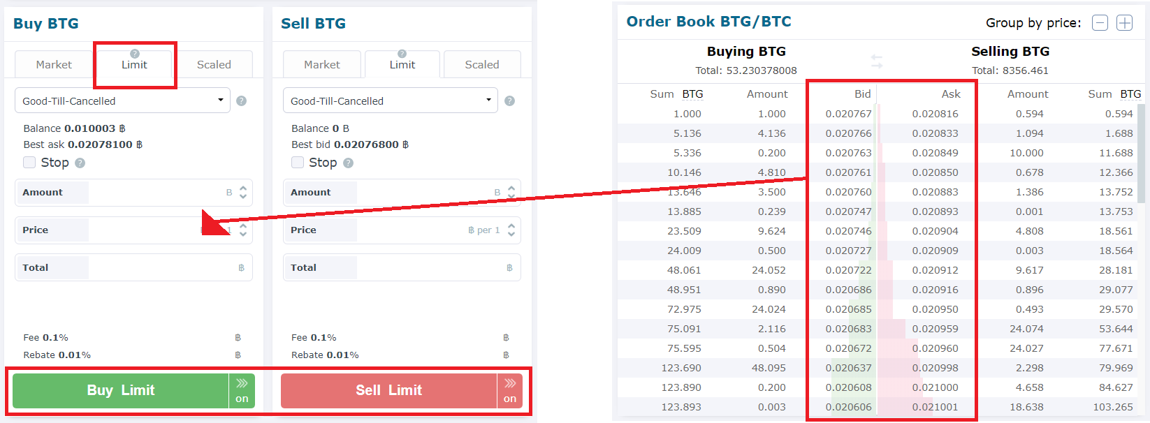 購入したい価格帯をクリックしTotal欄にペア通貨の枚数を入力すれば自動で何枚購入・売却できるか算出されますので確認の後「Buy Limit/Sell Limit」をクリックします。