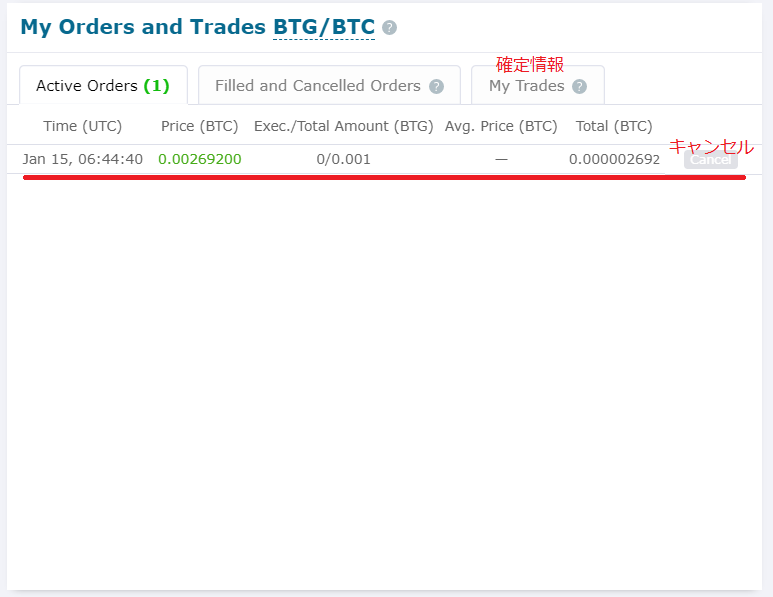 注文のキャンセルを行いたい場合は生成されたオーダー横のCancelボタンをクリックしましょう。