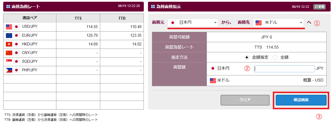 ①どの通貨からどの通貨へ資金を変更するか選択します。