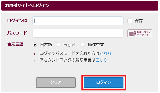 書類に記載されていたログインID、初回パスワード(後に変更が入ります)を入力の後「ログイン」をクリックします。