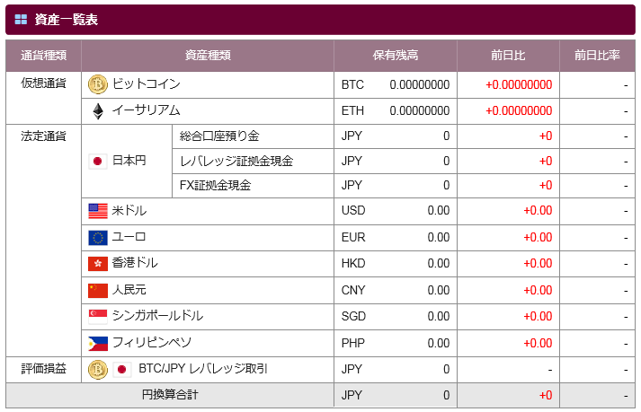 現物保有一覧…現在保有している仮想通貨・法定通貨を表示しています。