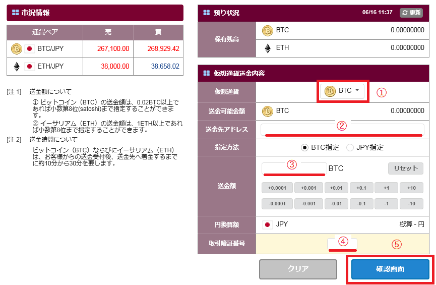毎時送信先を決める必要があり、BTC・ETHともに送信設定ができます下記手順で処理を行います。
