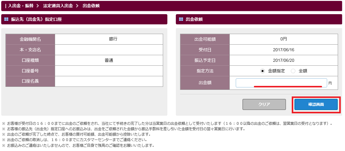 初期登録で口座登録をしていますのでをその口座でよければ出金依頼を行います。