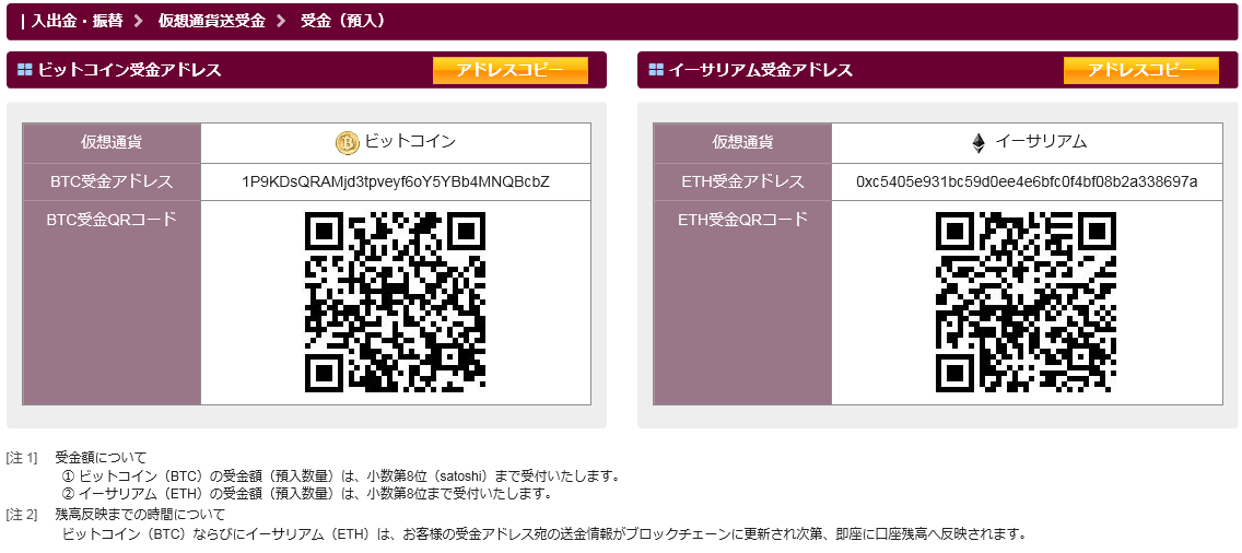 BTC・ETHともにアドレスが表示されていますのでそちらに振込を行います。