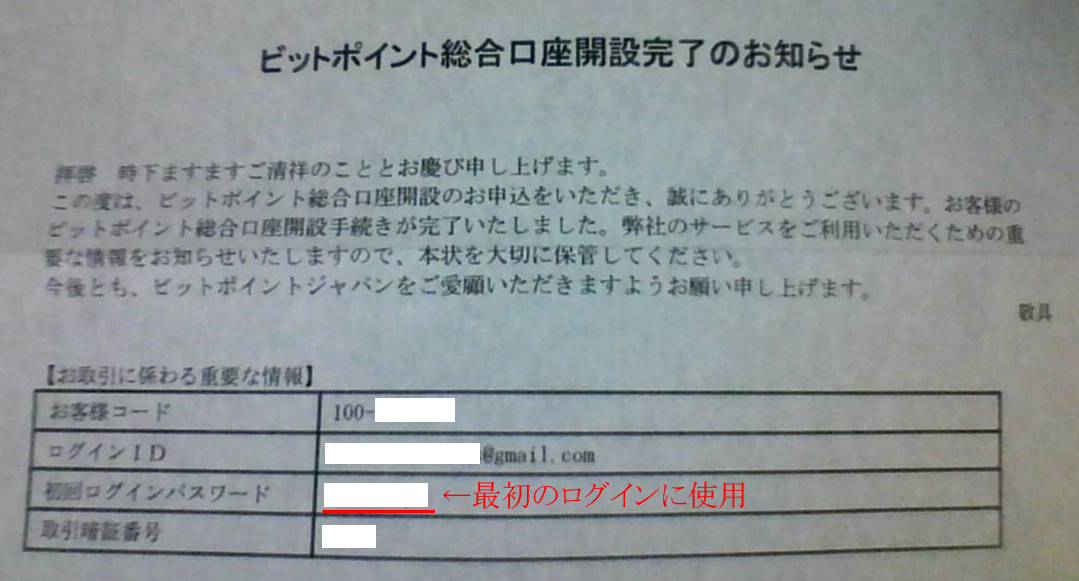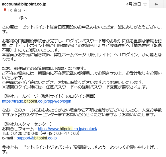 処理が終了すると審査の後審査合格(口座開設鑑賞)書類がBITPOINTから送られてきます。