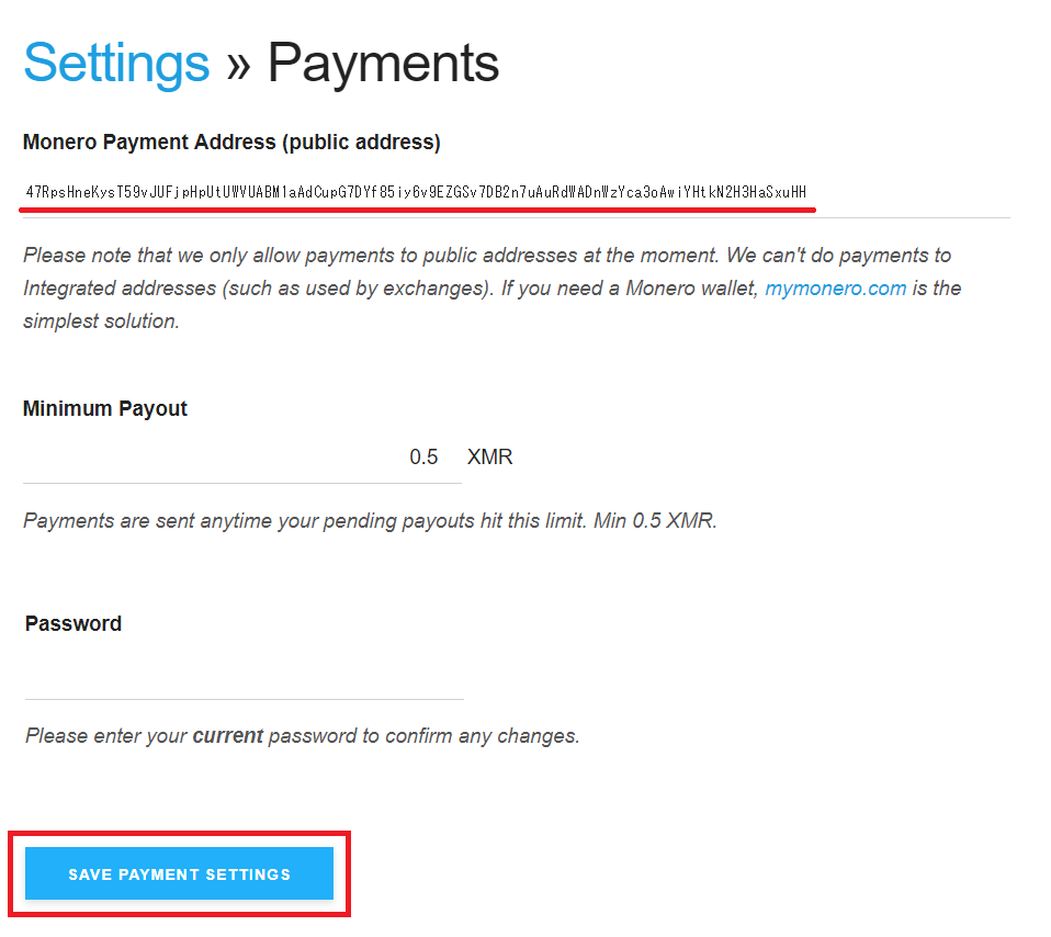 更新処理のためにPassword欄にパスワードを入力して「SAVE PAYMENTS SETTINGS」をクリックします。