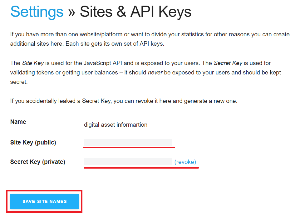 Nameにアカウントの名前(自身で決定)を記入して「SAVE SITE NAME」をクリックします。