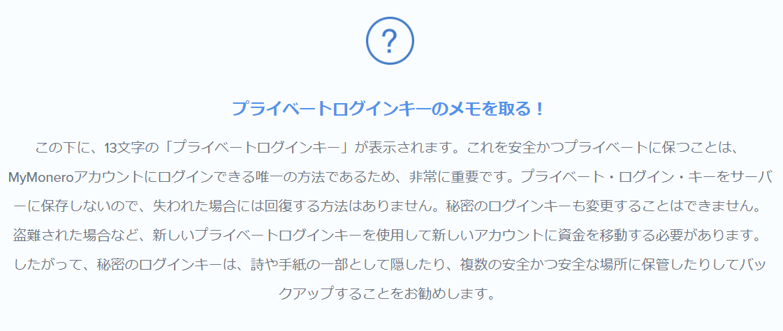 ※Private Login Keyはアクセスに必要な情報です。コピーして控えておきましょう。