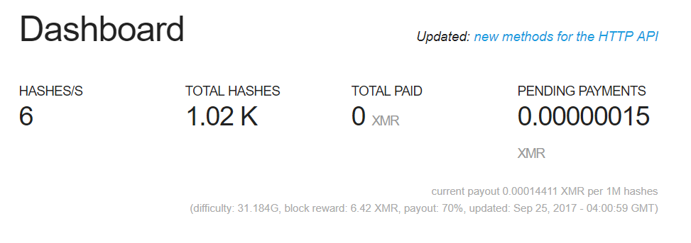 導入するとトップ画面(dashboard)の画面にマイニングの状況が確認できます。