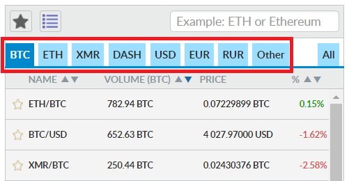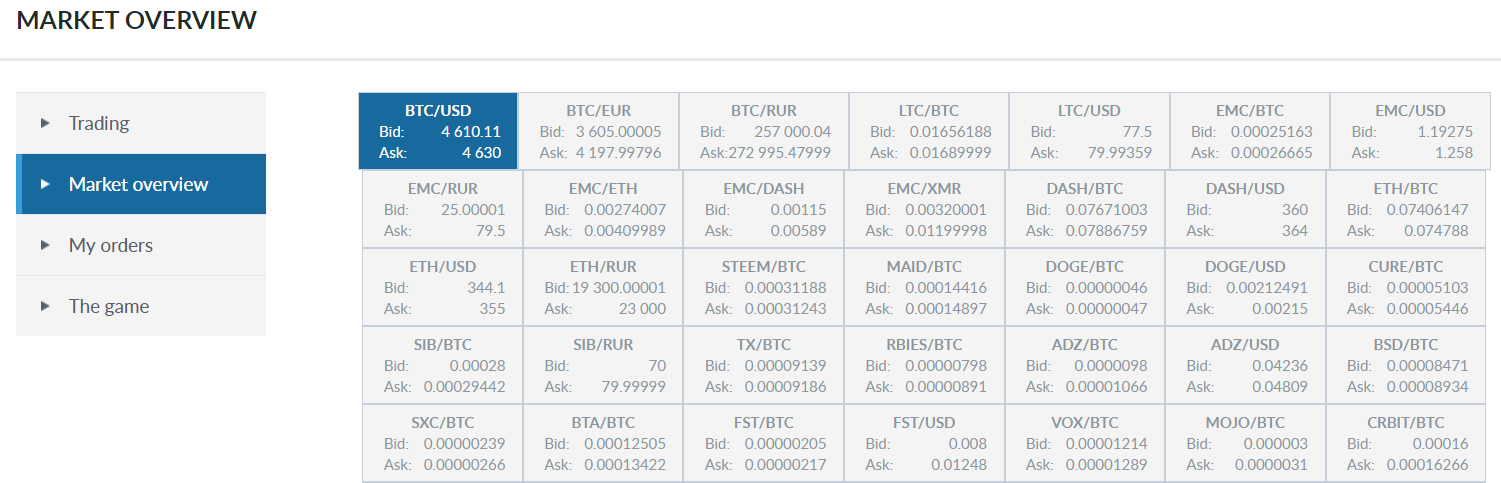 通貨ペア数が大変多く、BTC/ETH/XMR/DASHが主軸通貨として、フィアットもUSD/EUR/RURで取引を行うことが可能です。