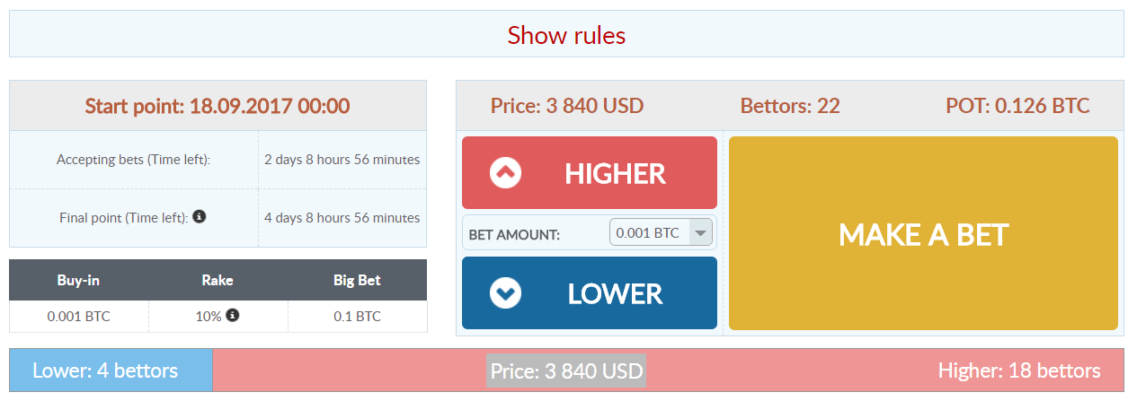 ゲームに参加するには、以下のルールに同意する必要があります。ゲームは完全自動モードで行われ、スクリプトは仲裁人として表示され、手作業によるモデレーションは完全に欠落しています。すべての価格は自動的にスクリプトによって固定され、勝敗は自動的に計算されます。新しいゲームは月曜日、GMT + 3時に始まります。ゲームが始まると、Livecoin ExchangeによるBTC / USDの開始価格が定義されます(小数点以下第5位まで固定されます)。ベットは金曜日23:59 GMT + 3まで受け付けています。この期間の終了後、BTC / USD価格の最終決定より2日前に合格し、勝つために価格の操作を回避します。最終価格(日曜日23:59 GMT + 3)を決定した後、開始価格と最終価格の比較が行われます。最終価格が開始価格よりも高い場合は、
