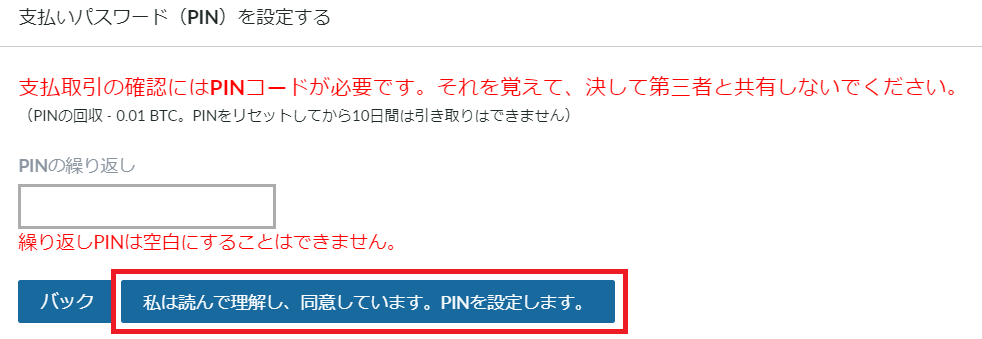 先ほどの数字を入力の後「PINを設定します」をクリックします。
