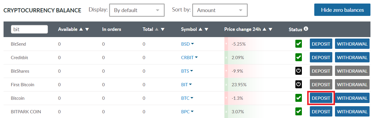 取引に使う通貨の「DEPOSIT」をクリックします。