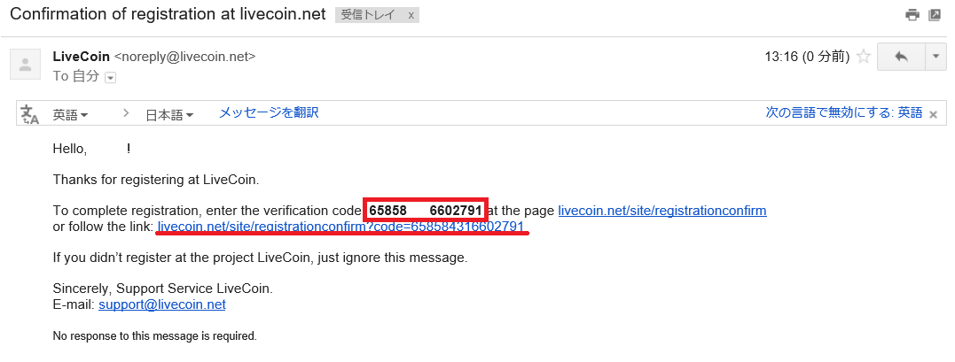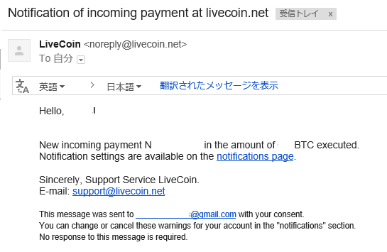 メールにLivecoinからアカウント認証のメールが届いています。