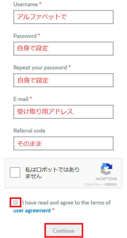 受け取り用のアドレス、ユーザー名とパスワードを自身で設定して利用規約にチェックします。
