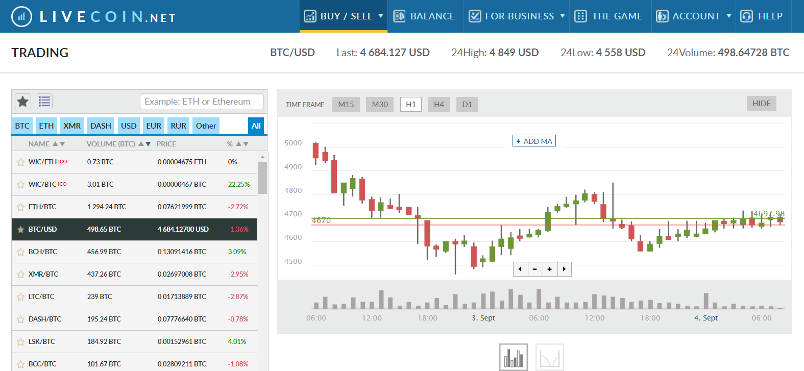 LIVECOIN内での各通貨ペアの取引高が確認できます。