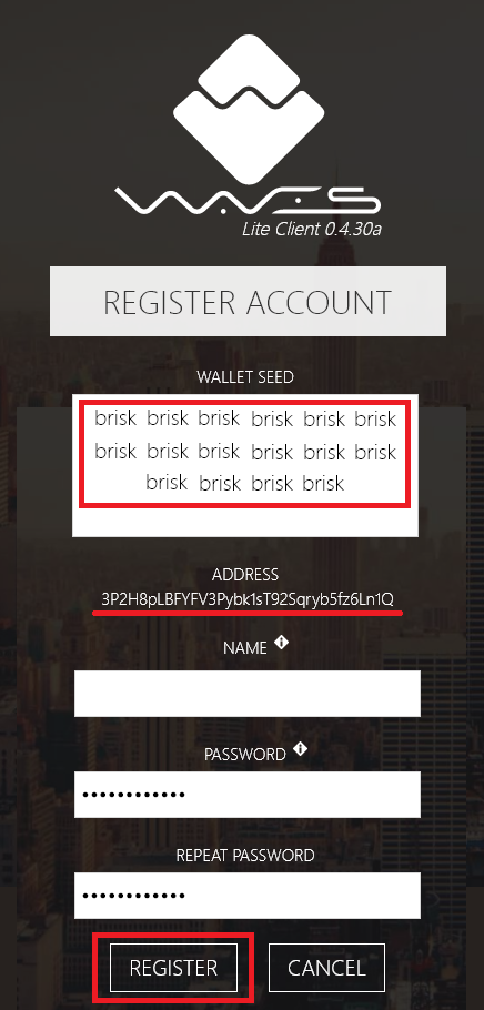 名前とパスワード(自身で設定)して「REGISTER」をクリックします。