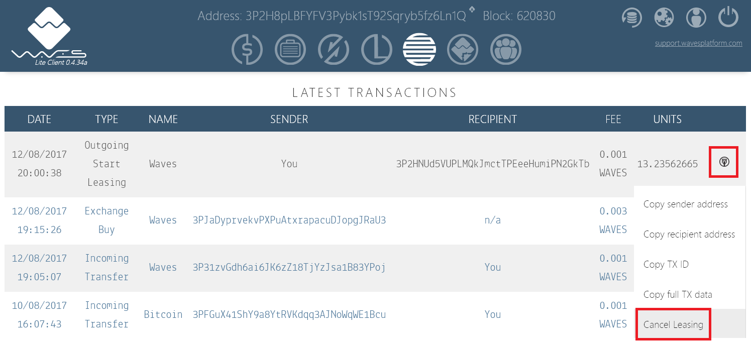 レンディングに出しているWavesのUNITS右のマークをクリックして「Cansel Leasing」をクリックします。