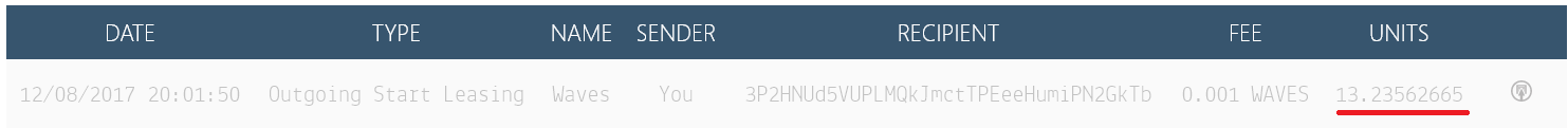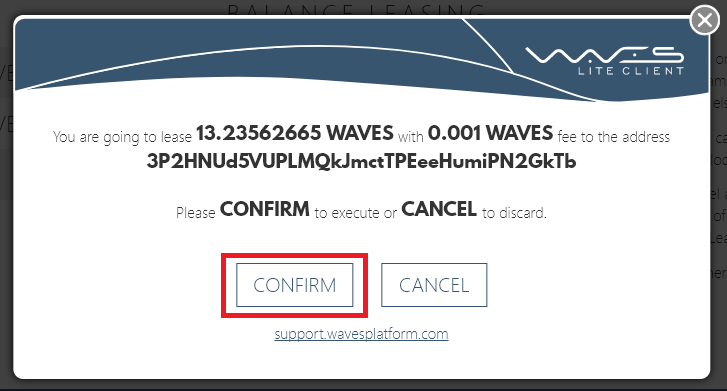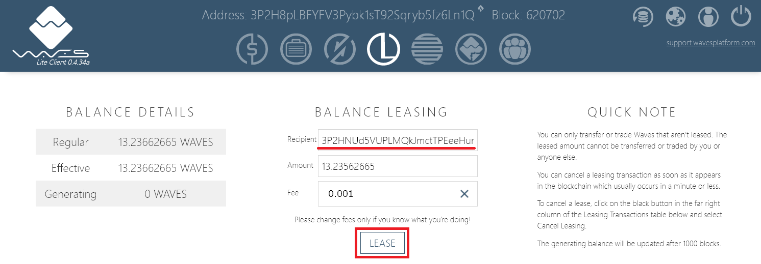 Recipientにアドレス、AmountにレンディングするWaves数を記入して「LEASE」をクリックします。